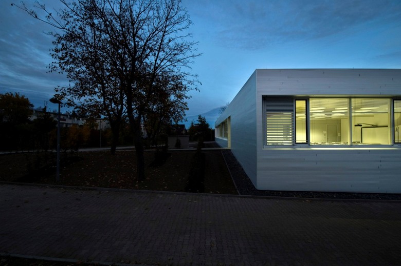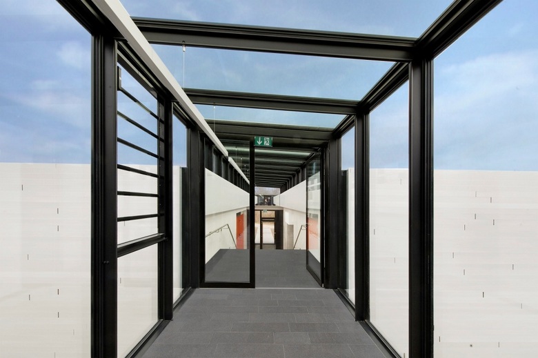 7 neue Klassenzimmer mussten in Passivhausbauweise an den Altbau angebaut werden. Die Anbindung erfolgt über einen Verbindungssteg. Fassadenbekleidung aus Aluminiumstrangpressprofilen, die in eloxierter Ausführung eine sehr monolithische und werthaltige Optik ausstrahlen. Im Innenbereich kontrastieren Sichtbetonflächen mit kräftigen Farben beim Bodenbelag und bei den Türnischen.
