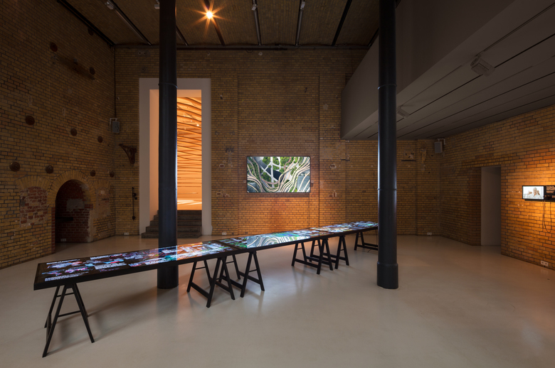 The organic shape of the building complex with its iconic louvres, and the generous planting, contribute to an improvement of the microclimate and increase biodiversity. Inspired by Asian paddy field terraces, the green center formed by the four towers—with its multi-story three-dimensional gardens—reflects the diversity of tropical flora and creates a new habitat. The compact and efficient layout design is complemented by energy-saving ventilation systems, highly effective external solar screening devices, and glazing that reduces solar radiation into the building. A space-filling sculpture is the central exhibit in the Aedes Architectural Forum; it models the deliberate design of the building shape so that it can be fully appreciated. A documentary film of the building by architectural photographer HG Esch, interviews with project participants, and explanatory diagrams of the project provide visitors with new ideas for architecture in mega-cities.