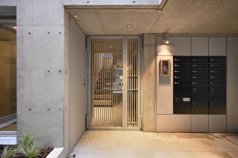 目黒不動尊の門前にある小さな商店街に面した敷地に計画された5階建ての14戸からなる賃貸集合住宅。東京都内の、間口が狭く、奥行きの深い敷地に、小さい賃貸住戸を効率よくレイアウトする際に設計者が頭を悩ませるのは、敷地の奥側の住戸の窓先空地の取り方である。