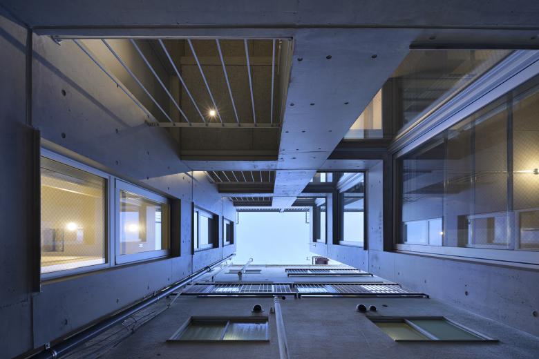 また2つのヴォリュームの四隅を切り欠いて、6か所のヴォイドを設け、各住戸に光を取り入れ、快適な内部環境を生み出している。このプロジェクトのように、周辺を敷地際まで建物で囲われた敷地において、特に低層階で隣地側の開口は採光上有効な開口部にできなくなることが多い。建物ヴォリュームの角を切り落とし、ヴォイドを設けて隣地との離隔を取ることで、ヴォイドに面する開口は、建築基準法の採光上も有効な開口となる。この集合住宅の延床面積では、窓先空地幅員に2m必要なため、1Fでは屋外通路が間口の1/4近くを占める。屋外通路はピロティも可能なので、2Fからは敷地境界から50cmの位置まで張り出している。上記のヴォイドのひとつにアプローチの屋外通路をつないで、法規上必要な窓先空地とした。窓先空地は避難経路としての機能に目が行きがちだが、居室の採光と通風の確保も目的としている。屋外通路につながっていないヴォイドも、住戸の快適性を確保するために効果的な「窓先空地」と言える。またヴォイドのひとつは隣の集合住宅の窓先空地に位置を合わせることで、空間を共有している。