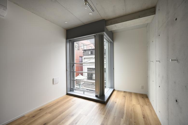一般的なワンルームの住戸は、廊下を中央に設けて、その左右にキッチンやユニットバスなどの水回りを設置して、奥にベッドルームがあるパターンが多い。しかしこの集合住宅では、水回りを建物ヴォリュームの中央に寄せて廊下を壁際にすることで、6つの「窓先空地」をつなぐ抜けを住戸内に生み出している。それにより、前面道路から、敷地の奥まで視線の抜けができ、風の通り道ができる。2人用の1LDK住戸がある奥のヴォリュームも、水回りを中央に設けて、リビングとベッドルームが、玄関やキッチンを通って回遊できる間取りにしている。住戸の開口は「窓先空地」に面する部分だけに設け、抜けの内側にプライバシーを確保している。