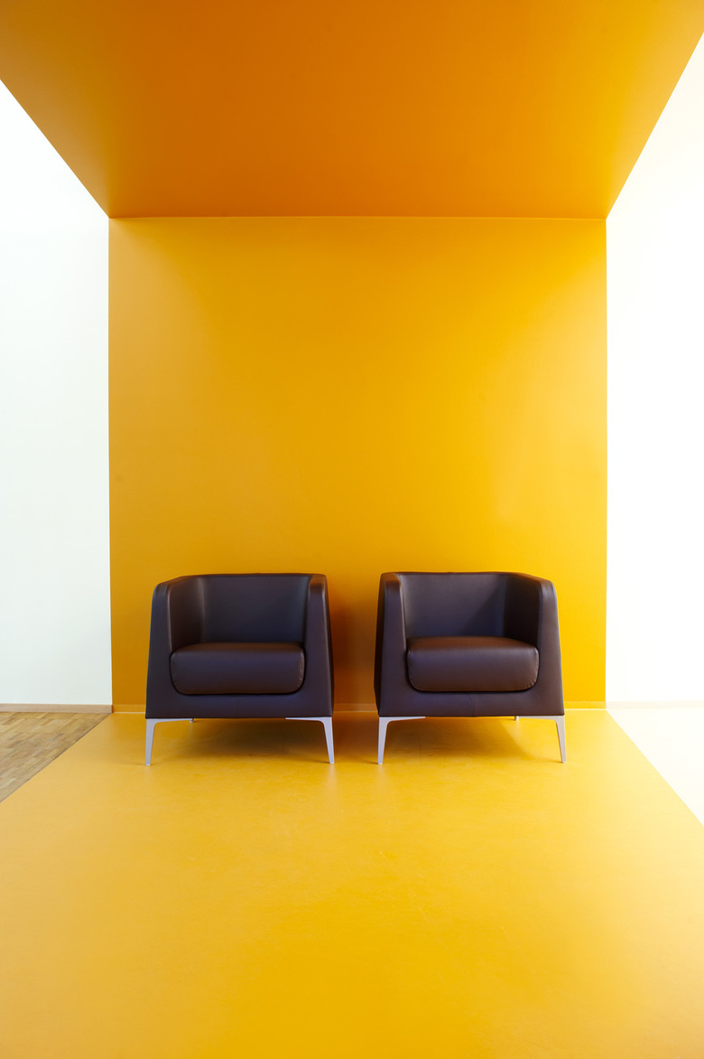 Den geringen Raumhöhen im Verkaufsbereich begegnet der Entwurf mit einer strukturierten Deckenlandschaft, welche den Raum zwischen den alten Holzbalken nutzt. Die in das Deckenraster ‘eingewebten’ Lichtbänder der Deckenleuchten und die insgesamt helle, leicht nuancierte Farbgebung beleben den Raum. Wie die Decke, strukturiert sich auch der Raum, in verschiedenen Ebenen aufgelöst. Die Verkaufsregale werden als Schicht an der Gebäudeaußenwand entlang geführt, lösen sich ab, bilden so den Zwischenraum der Werkstatt und folgen dem Wandverlauf in die Raumtiefe.