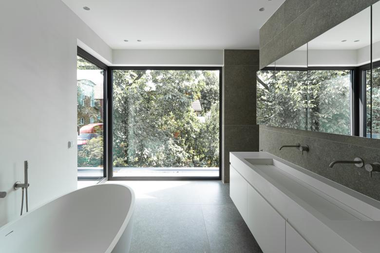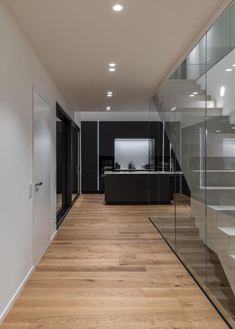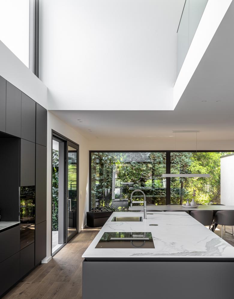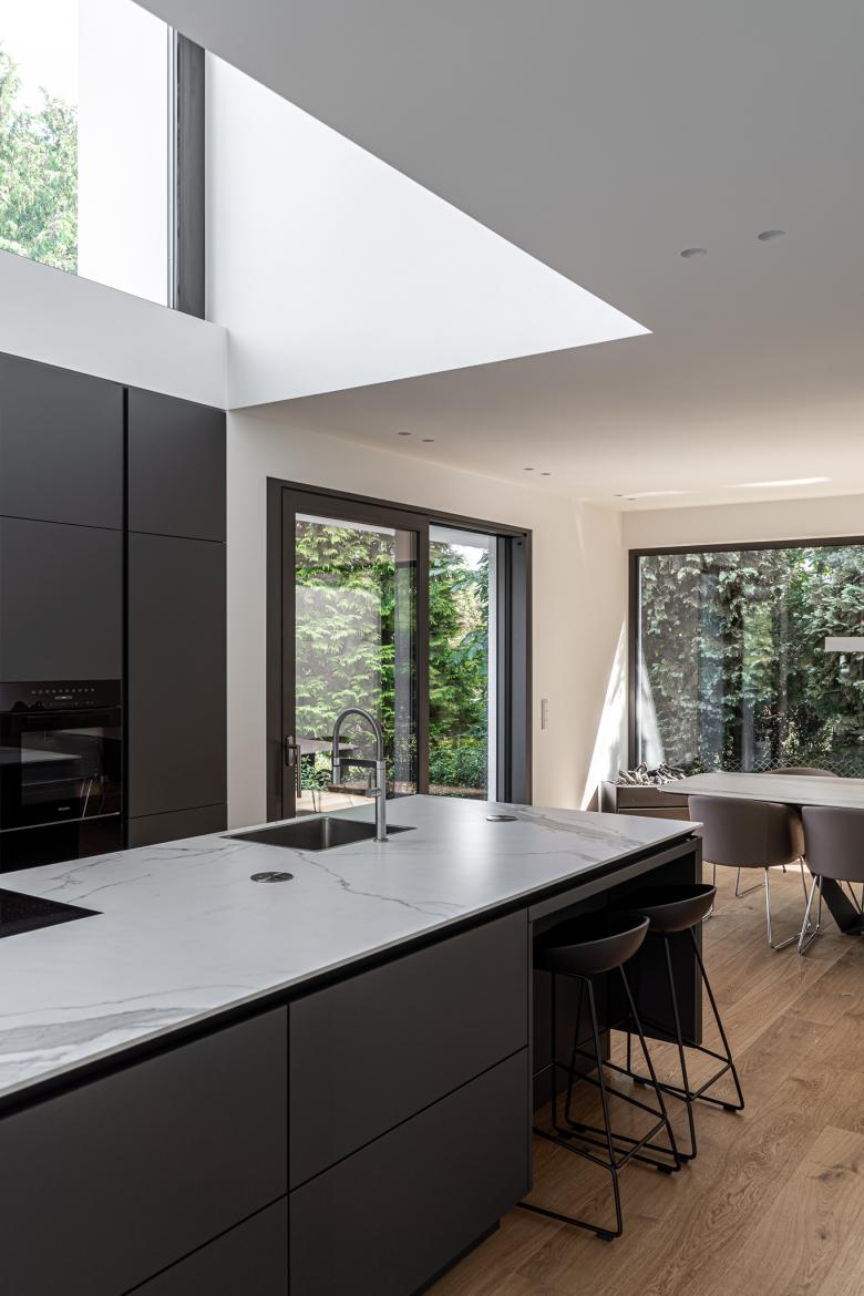 Über der Küche öffnet sich der Raum zu einer Galerie. Ein Oberlicht über dem Küchenblock schafft spannende Lichtverhältnisse.