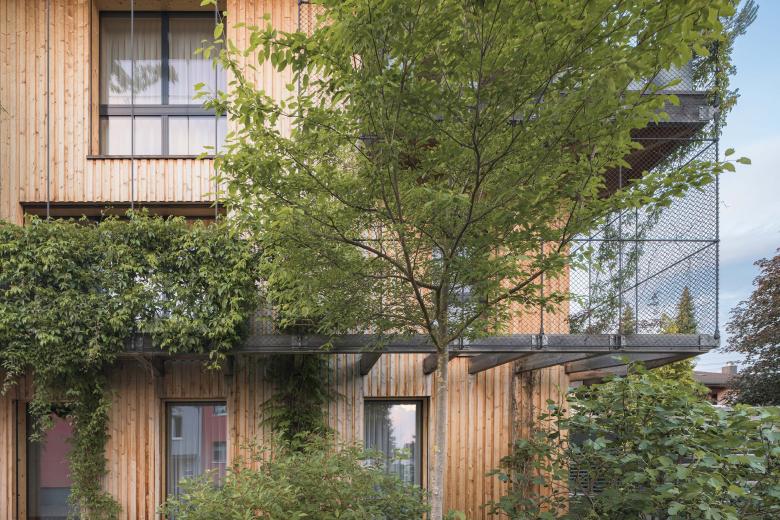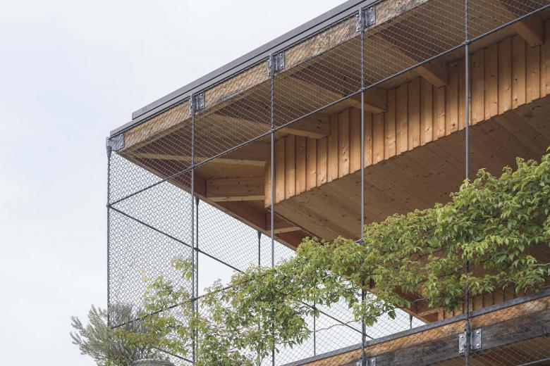 Ein vertikaler Garten rankt an einer feinen Gitterkonstruktion empor. Dieser ermöglicht Aussicht an den schönen Stellen und lässt die Bewohner ansonsten auf die sorgfältig ausgewählte Bepflanzung blicken.