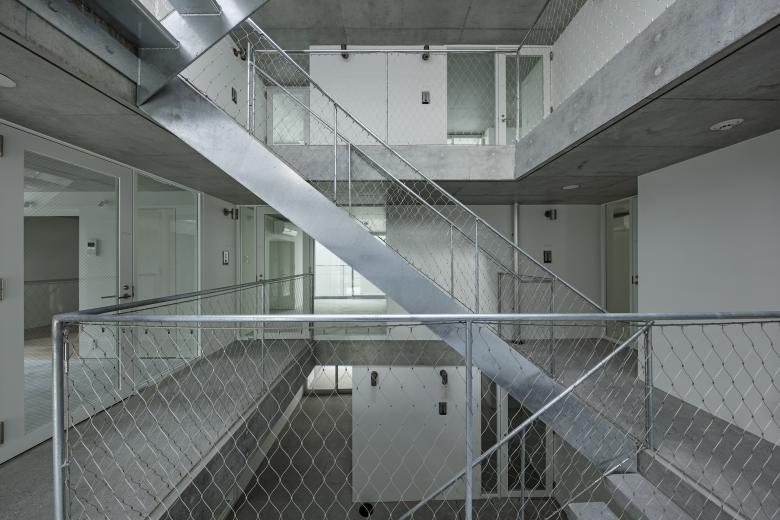 生活においてプライバシーを確保したい場所をボリューム(箱)として、解放したい場所を透過性の高い土間空間(孔)として計画している。孔として位置づけられた土間空間は、外部の都市環境と、建物内部の共用部の両方に対して開かれ、都市環境・生活空間・共用空間といった明確な区分で捉えられていた領域区分を階調的に捉え直す端緒となる。