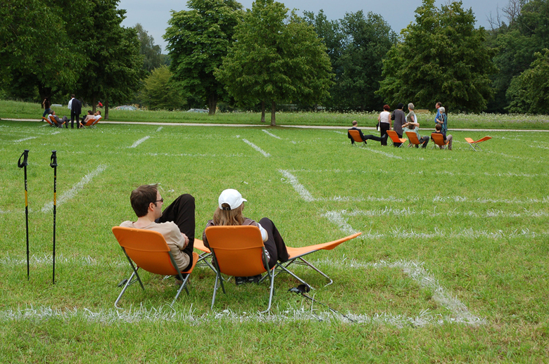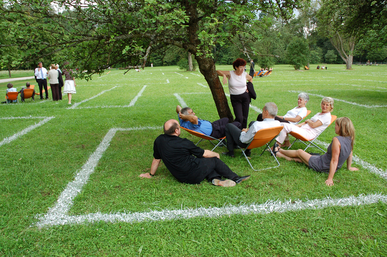 Mit einem Markiergerät werden die weißen Linien auf den Rasen aufgetragen. In Abhängigkeit von Wetter und Wachstum des Rasens, verschwindet die Struktur allmählich. Die Ornamentik thematisiert die Geschichte des Rokoko-Lustgartens und die Verwendung von Markierungssystemen aus dem Sport weist auf den Freizeitcharakter der Anlage heute hin.