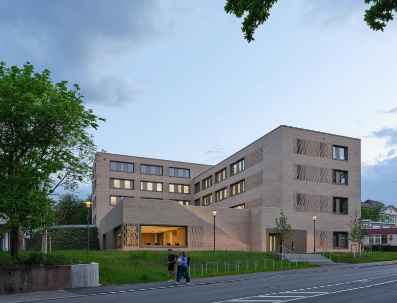 Eine einheitliche Klinkerfassade fasst die Gebäudeteile optisch zusammen und gliedert den Neubau mit Bändern aus Fensteröffnungen und Luftmauerwerk geschossweise.
