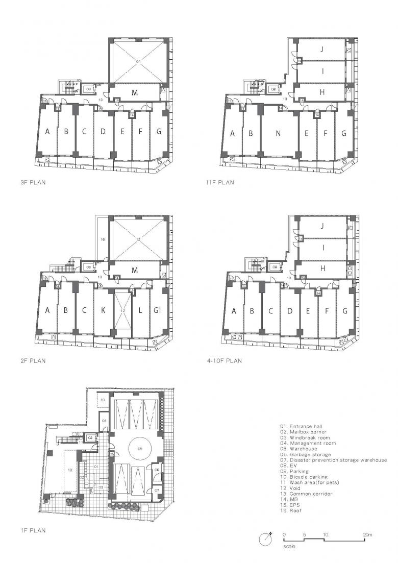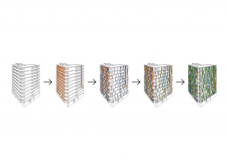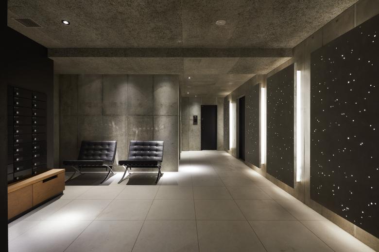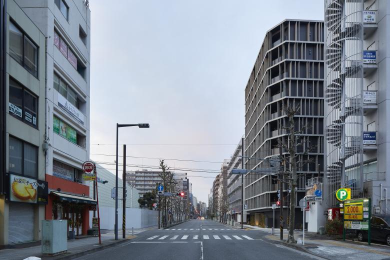 集合住宅は、中の構成をそのままファサードに表現される事が多いが、内部から求められる開放性を確保しながら、ファサードの面を形成するために、微細なパネルで内部の要素を包んだ。防火帯建築の様に通りに面する都市の構成要素としてのファサードの可能性に着目し、デザインの多様性も持ちながらも、既存の建物群と有機的な関係を持って、都市空間を形成できないかと考えた。
