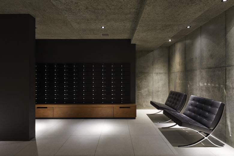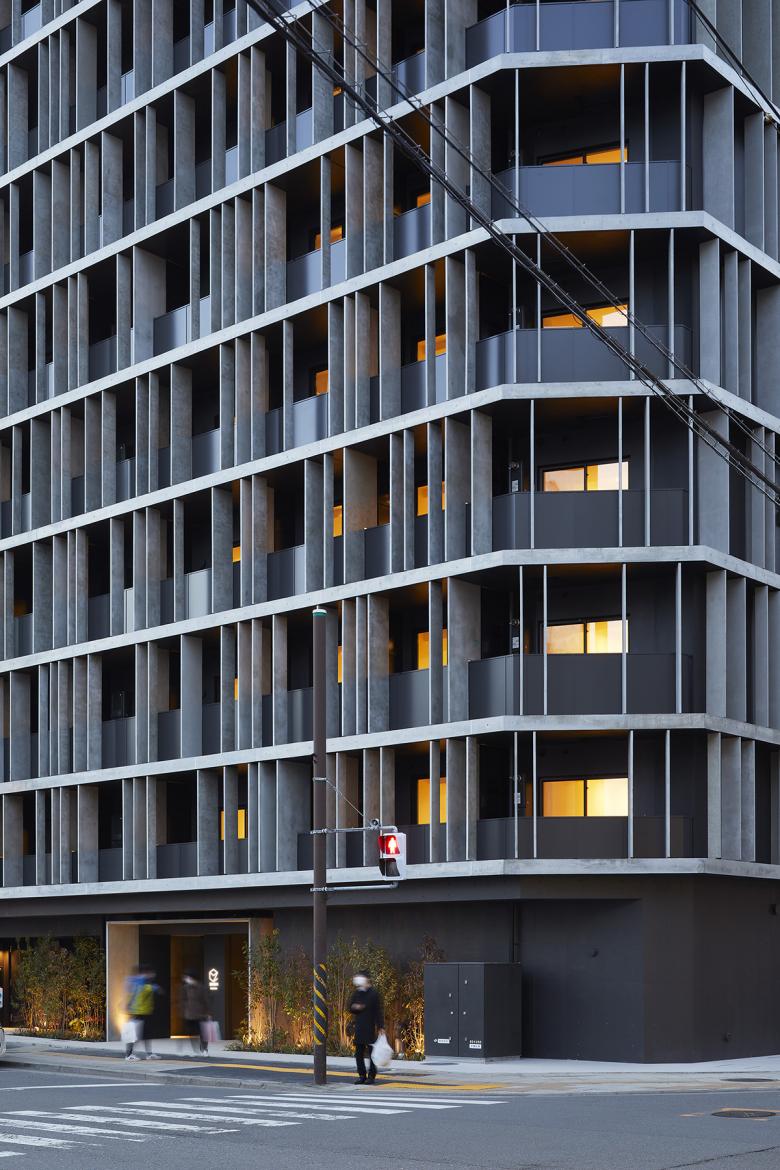 このプロジェクトでは、各階のスラブを前面まで持ち出して水平ラインを強調する事で、水平性を強調して、近隣の防火帯建物に馴染ませる様にしている。また、バルコニーで小さな住戸ユニットが強調されず、ファサードを大きな面として表現しつつも、内部から感じる開放感を失わない様にするために、これらの水平スラブの間に縦糸の様に薄いコンクリートパネルを配置した。隔て壁部分には住戸区画を兼ねた奥行きの深いパネル、それ以外の部分にも様々な奥行きのパネルをランダムに設置する事で、戸境を目立たせないようにしつつ、ファサード全体をリズミカルな面として表現した。