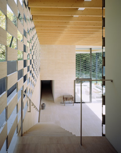 The structure itself is composed essentially of holes. It is divided into two wings, with a hole-shaped terrace in between serving to connect the woods behind the house with the woods on the opposite bank of the river. The wall surfaces are also composed of countless holes. I wanted to create light walls that the wind would sweep through using stone, normally a massive material. I had taken the same approach (a light, porous wall surface that takes advantage of the texture of stone) once before, in the Stone Museum (2000).