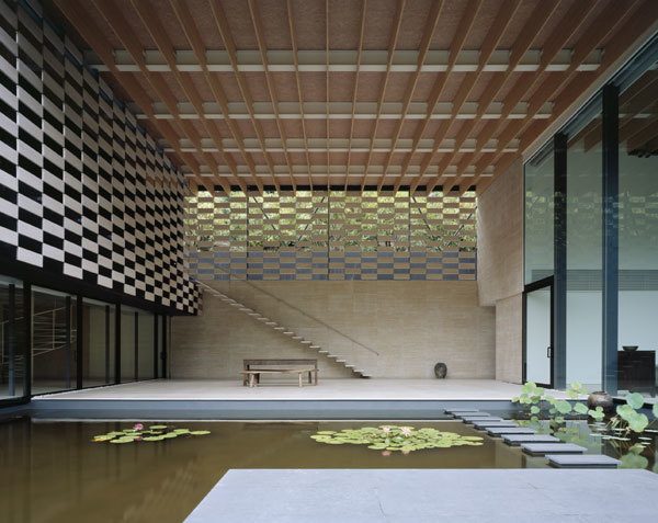This house sits beside a quiet river, deep in the mountains. My concept for the project was to lay waterways between the river and the house and plant them with lotus flowers, so that that the lotuses would link the dwelling with the river, and with the woods on the far side of the river.