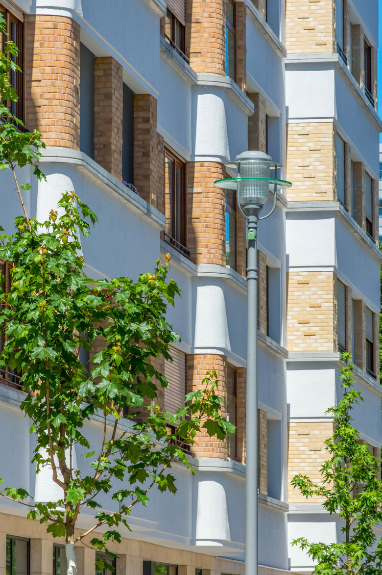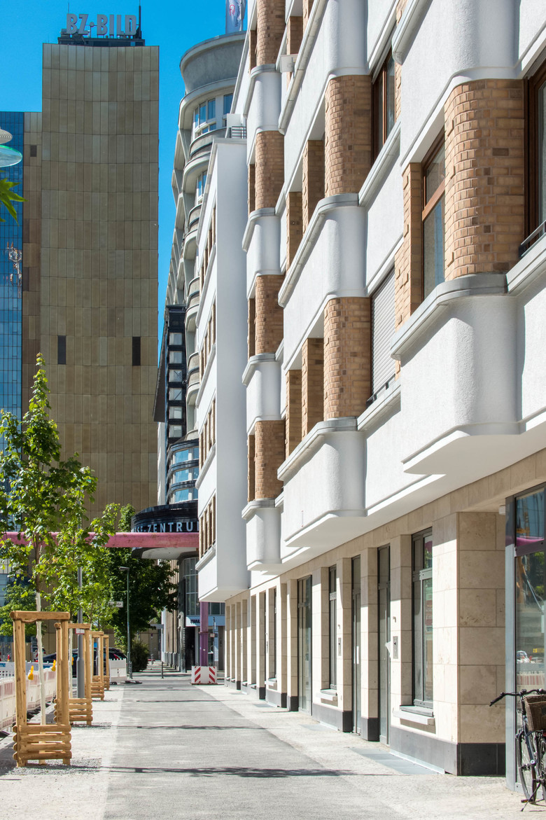Der Neubau von 129 Wohnungen in Berlin-Mitte greift die historische Blockstruktur auf und schließt den Blockrand umlaufend. Die einzelnen Häuser orientieren sich in ihrer Dimension und der relativ großen Parzellierung am städtebaulichen Umfeld. Gegliedert werden die Fassaden durch leichte Vor- und Rücksprünge, Gesimse sowie einen Wechsel in der Materialität. Das markante Motiv der abgerundeten Ecke setzt sich in der Gestaltung der Erker fort. Der gemeinschaftliche Innenhof wird als „Park“ konzipiert. Der Sockel vermittelt die hohe Wertigkeit und Dauerhaftigkeit einer Architektur, die sich bewusst auf die Formensprache der 1930er-Jahre bezieht und Assoziationen etwa an die großstädtischen Wohnanlagen aus dem vorigen Jahrhundert weckt.