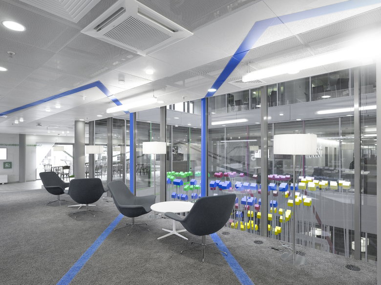 Ausstellungsgestaltung, Dauerausstellung "MICROSOFT CITIZENSHIP". Ausstellungskonzept mit verschiedenen Ausstellungs- / Wahrnehmungs und technologischen Ebenen. Anamorphe Raumgrafiken definieren und zonieren Themenfelder und sind gleichermassen Türen in virtuelle digitale "augemented reality" Ausstellungsräume.