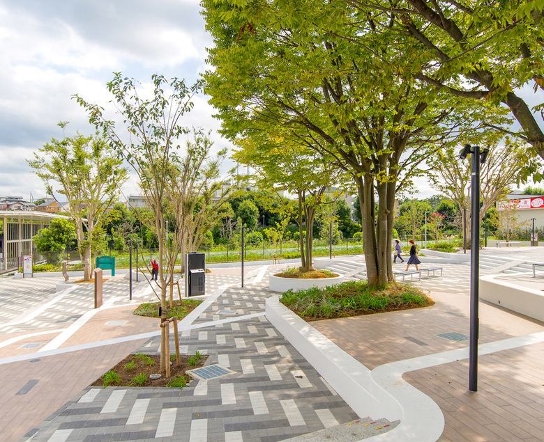 STGK designed a plaza in front of the Minami-Makigahara station, which is a part of the redevelopment of the station front. In this area, there is approximately four-meter level difference between the station and the residential area, which used to divide this area into two parts by steep steps and slopes.