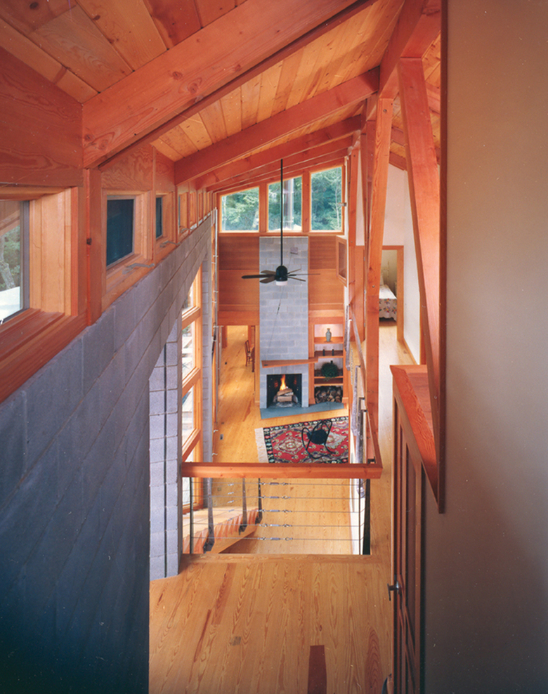 A composition of traditional vernacular forms, the southern portion of the building gives way to an idiosyncratic ordering of frames and volumes along and perpendicular to the concrete block wall. The northern concrete block wall, articulated in both the interior and exterior of the house, conflate the concept of interior and exterior, mirroring the concurrent experience of site and view at the exterior. This bleeding of interior and exterior recurs in the continuous clerestory windows that separate the roof from the wall and allow the roof to “float” above the wall. The framed sky and foliage remain a constant presence along the edge, maintaining sustained visual contact with nature.