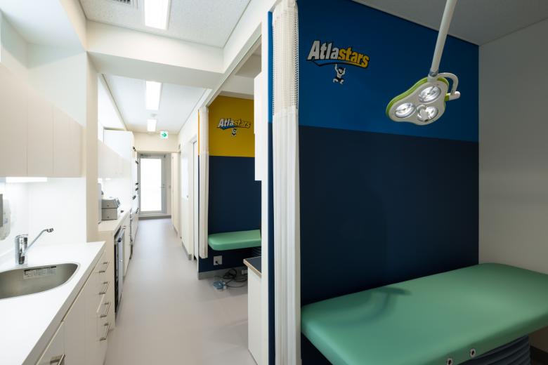 We have realized a relaxing rehabilitation space with linoleum flooring and wooden partitions that take advantage of the soft natural light and a high-density medical care space with appropriately selected medical equipment and conductors arranged in a precise manner.