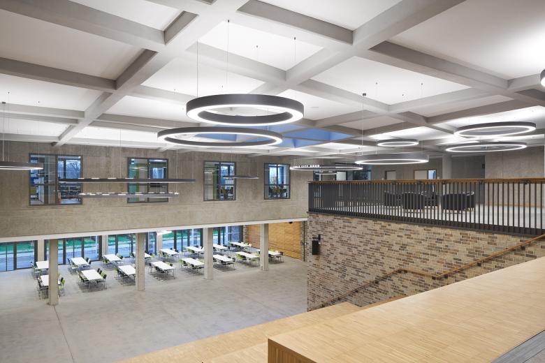 Der Baukörper entwickelt sich in den oberen vier Geschossen um ein Atrium, Sockelgeschoss und 1. OG um ein zweigeschossiges zentrales Foyer. Den räumlichen Mittelpunkt der Schule bildet eine großzügige Freitreppe, die das erdgeschossige Forum mit Mensa und Konferenzbereich mit dem Verwaltungsbereich im 1. OG verbindet. Die oberen Unterrichtsgeschosse sind in große Kompartments mit unterschiedlichen, offenen Raumstrukturen für vielfältige, freie Lernsituationen gegliedert. Forum, Freitreppe und Galerie bieten Raum für Lern- und Pausenbetrieb sowie für kommunikative Begegnungen.