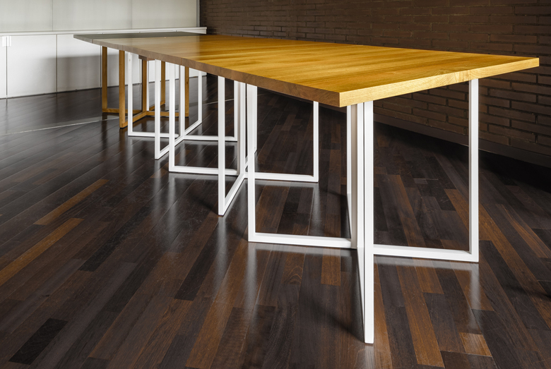 Its table is designed as a modular item which can modify the length depending of the need and a drawer is placed bellow the table with an opening in the center where you can put the cabling, normally annoying on meeting situations.