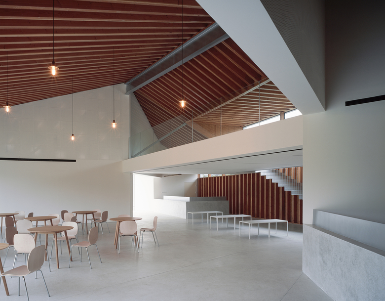 The irregular quadrangle footprint responds to its surroundings. The closed back blocks the city traffic to its north, while the open façade faces the greenery of the park on the south. This club is intended for both the club members and the general public, therefore the building is seeking a balance between exclusiveness and inclusiveness. The structural design works in concert with space’s nature of compatibility: The entity is supported by the steel structure and wrapped by a Douglas fir system from the pitched roof to the facade walls. The upper part of the full height wall in the main space is built with perforated panels. In this way, it subtly connects the spaces on the two sides of the wall when light travels through slightly and reveals the hidden steel frame inside.