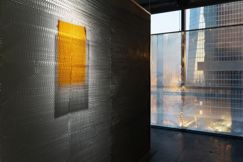 一道铝蜂窝芯顶廊由入口延伸至整个主展厅空间,在尾厅转化为立面,引导观众的观展流线的同时,引领着空间叙事节奏。 铝蜂窝芯正立面可看透至一侧的城市景观和另一侧的艺术作品,随着观众的走动,观看角度随之变化,材料呈现金属质感并反射临近的景像与光线。 一日间不断变化的自然光线和其他观众的漫游身影映射在铝蜂窝芯墙面上, 形成动态的光影质感, 观众在观展的过程中,遇到只属于此刻此地的观感记忆。