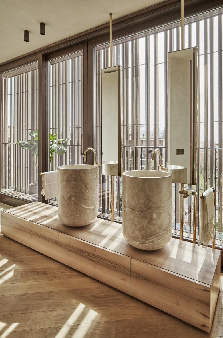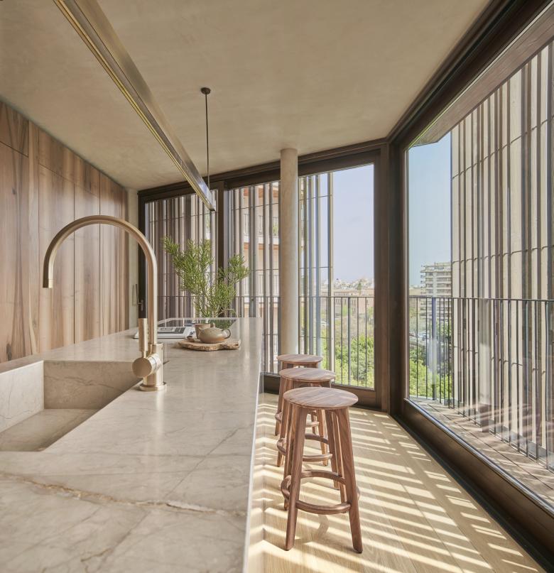 La selección de materiales naturales, locales enfatizando la esencia mediterránea ha sido muy importante. Una paleta simple de materiales nobles como puertas macizas de nogal francés, interiores de armarios de cedro, roble seleccionado, enlucidos tradicionales de cal en paredes y techos, lavabos macizos de piedras locales o piezas de bronce envejecido definen los interiores de las viviendas de Paseo Mallorca 15. Acabados cuidadosamente seleccionados por su calidad, teniendo en cuenta detalles, texturas y olores.