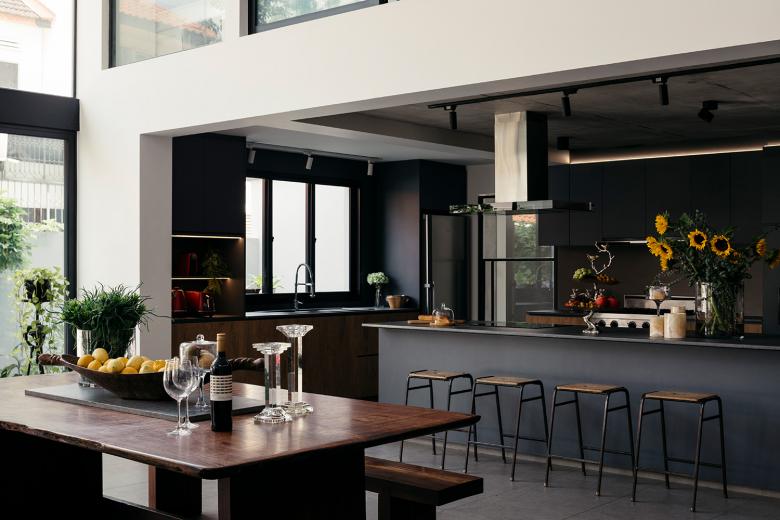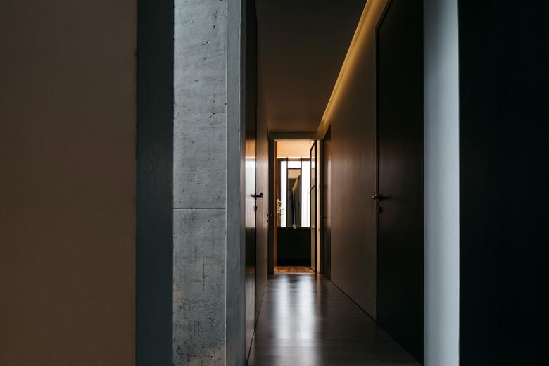 Der Kontrast zwischen hellen und dunklen Bereichen, dem Spiel von Tageslichtöffnungen und Kunstlichtakzenten fügt die Stilebenen sorgfälltig in das Gesamtkonzept ein und erzeugt eine besondere Atmosphäre, die perfekt auf die Ansprüche der Bauherrschaft abgestimmt ist.