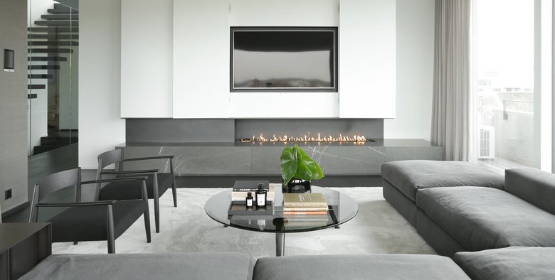 Die neue Küche ist funktional und elegant in den Wohnbereich eingebaut. Ein schönes Detail ist der Übergang von der Küche zum Gang; hier wurden die Ecken auf Gehrung zusammengeführt. Der Kamin mit integriertem Fernseher war nicht einfach in der Planung. Eine elegante und saubere Lösung braucht oftmals eine Planung mit viel Liebe zum Detail. Im grosszügigen Kinosaal, mit verstecktem Beamer und Leinwand in der Decke, findet man einen begehbaren Weinschrank. Es entstand ein modernes und zeitloses Wohnkonzept in dem man sich gleich zu Hause fühlt.