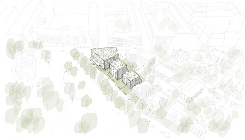 The plot is in a residential area surrounded by buildings from the 1800s and 1900s. Through a conscious use of high-quality location and situation-adapted architecture, the aim is to reinforce and develop the inherent identity of the place. P77 becomes an environmentally friendly and urban residential environment with high architectural qualities.
