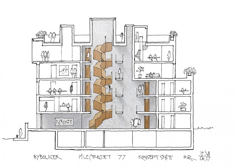 The project unites tradition and innovation in a carefully reflected way and provide good homes that will help to form a qualitative neighborhood. Pilestredet 77/79 has been designed to combine new buildings with a historic environment in an attractive and innovative way.