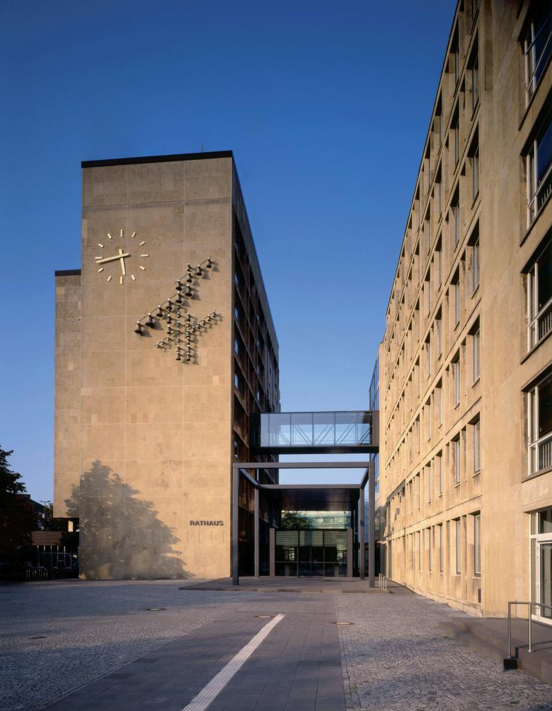 Durch die Neuordnung des Haupteingangs über ein zentrales, klar markiertes Eingangsgebäude werden die Wege in und durch das Rathaus vereinfacht. Die Schaffung von zusätzlichen Flächen durch einen Erweiterungsbau bietet die Möglichkeit ausgelagerte Dienste in das Rathaus zurückzuholen. Der Erweiterungsbau nimmt in seiner Fassadenstruktur die Gliederung und Materialität des Bestands auf, interpretiert diese jedoch in zeitgemäßer Form.