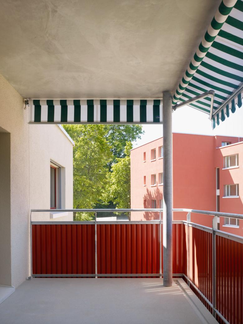 Als willkommene Erweiterung des Wohnraums dient ein neu angebauter Balkonturm mit Blick ins Grüne und über die Siedlung Schatzacker. Die grün-weiss gestreifte Markise sorgt dabei für sommerliches Flair und schützt vor Sonne und Blicken.