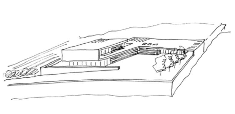Der gesamte Entwurf entsteht aus der Bewegung eines weißen Wand-/Deckenbandes. Dieses beginnt als Grundstücksmauer an der öffentlichen Straße Mudronova, begleitet die Auffahrt, umrahmt winkelförmig einen Vorplatz, klappt um und wird zum Dach des EG, bevor es als mäanderndes Band die privaten Schlafräume der Botschafterfamilie "einhüllt".