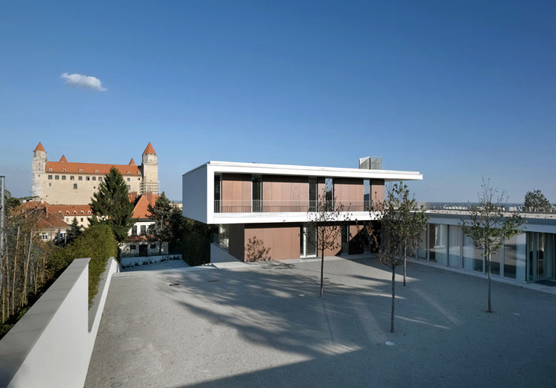 In Bratislava, auf einer Erhebung mit weitem Blick nach Süden über die Donau, steht die neue Residenz des Deutschen Botschafters in der Slowakei. Im Westen thront vis-à-vis des Neubaus die Burg, das Wahrzeichen der Stadt. Der Entwurf interpretiert und zelebriert die Wege und Ausblicke des Grundstücks.