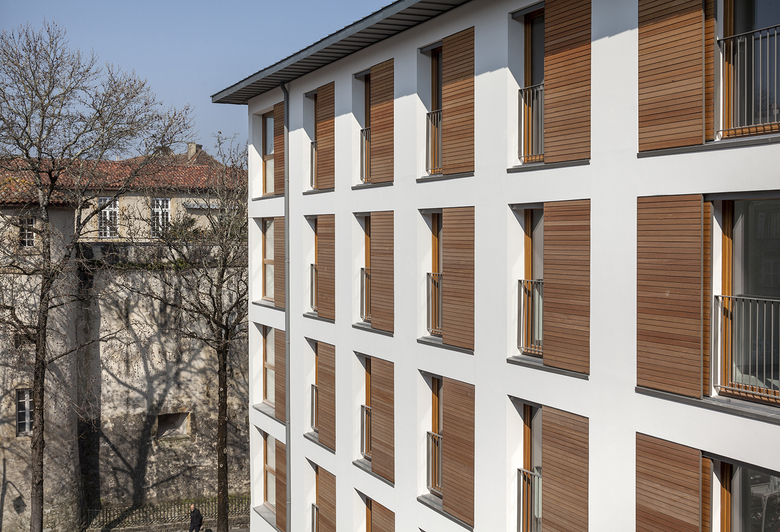 Die Schiebeläden des Modells H Bois von Griesser fügen sich perfekt in die Fassadengestaltung ein und entsprechen den hohen Anforderungen des Gebäudes, das Design und höchste Technik mit einem edlen Werkstoff vereint: dem Holz.