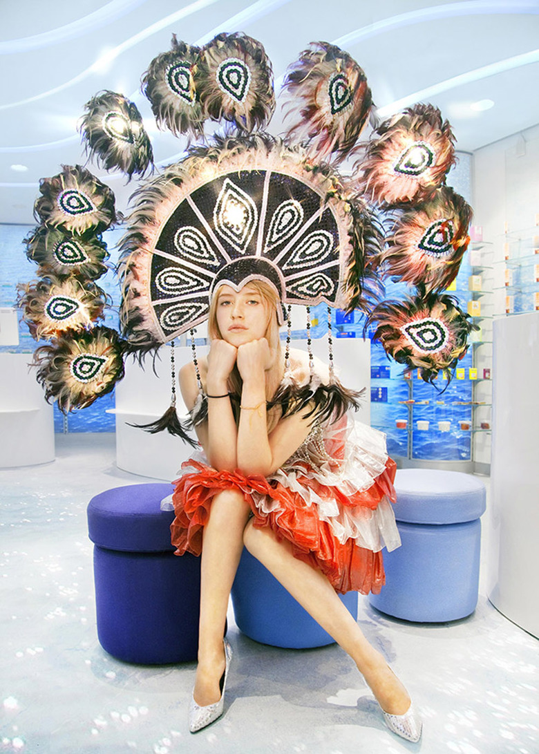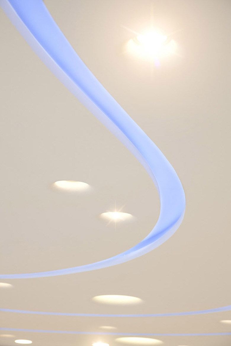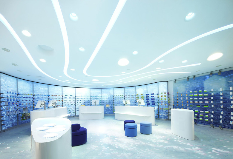 Unter dem Motto „Wasser ist Leben“ wurde die alteingesessene Apotheke komplett umgebaut. Tiefes Blau, leuchtende Oberflächen und dynamisch geschwungene Linien prägen den umgebauten Verkaufsraum und verwandeln ihn in eine Meereswelt. Um dem Interieur mehr Weite zu geben folgen alle Elemente der Wasser- Metaphorik: ebenso wie die fest eingebauten Regale sind auch die Lichtbänder in der Decke wellenförmig konzipiert, während die freistehenden Möbel in ihrer Gestaltung und Anordnung dem Wasserverlauf zu folgen scheinen. Wie schwebend wirken die auf gläsernen Regalböden angebotenen Heilprodukte vor den glitzernden Wänden. Wasser als Sinnbild für Leben und Heilkraft, die auf die eigentliche Bedeutung des Ortes zurückverweisen.
