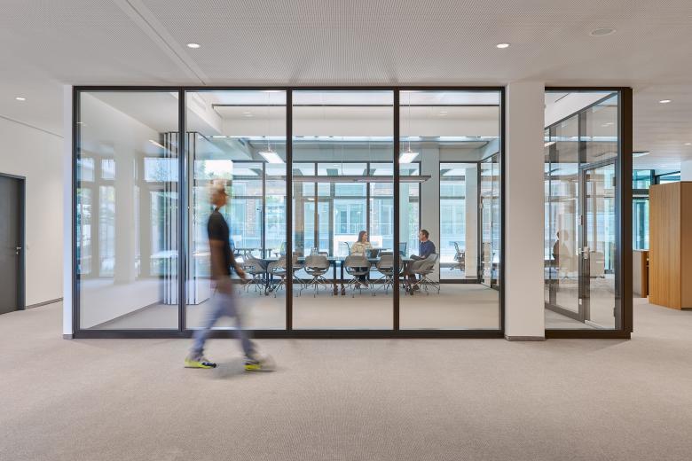 Die Großzügigkeit der Lobbys bieten auch Raum für flexible Arbeitsplätze, lange Arbeitstische, Rückzugsnischen und Besprechungsräume.
