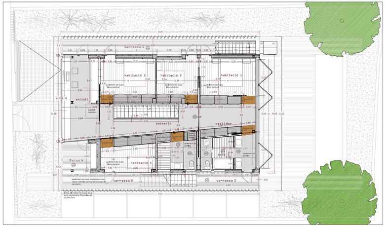 House clearly divided in two areas, a ground floor connecting with all the exterior, and an upper level that searches for a great deal of privacy from the neighbours. The house follows the main entrance axis as an excuse to relate to the exterior. Lateral facades happen to be more eclectic and neutral. Trying all time to disallow the others to know what’s going on inside. Lower program is dedicated to day related activities, leaving the upper level to bedrooms and a common open–studio space. The roof is proposed as an open and active roof, for the users to enjoy the Mediterranean climate.