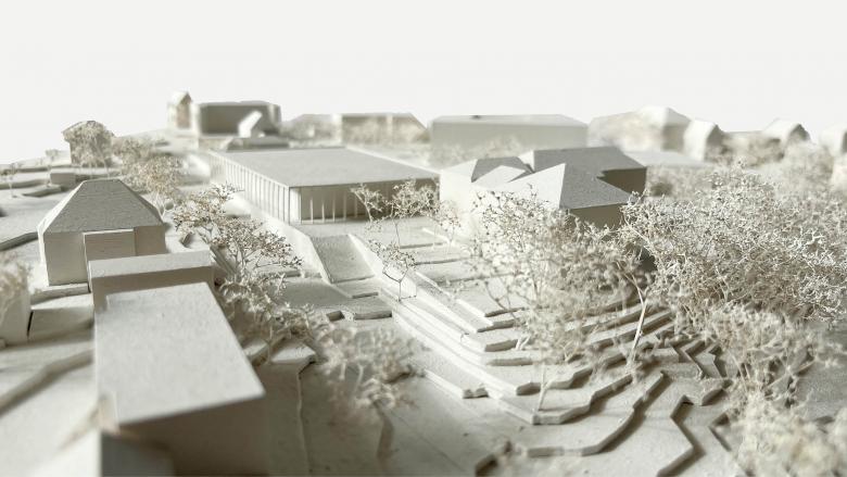 Die Stellung im Stadtraum | Aufgrund ihres Selbstverständnisses als öffentlicher Baukörper positioniert sich die Sport- halle, auf einem Sockel liegend, selbstbewusst im Straßenraum der Lindauer Straße. Da- durch wird sowohl eine Präsenz im Stadtraum erzeugt, als auch die Lesbarkeit der da- hinterliegenden Struktur, der Schule, vom Straßenraum aus gestärkt. Außenräumlich wird eine wechselseitige Adressbildung zwischen Schule und Stadt- baukörper, innenräumlich eine Blickbeziehung zum städtischen Raum, ein „Fenster zur Stadt“, erreicht. Um diesen deutlichen Mehrwert zu generieren, wird von der in der Aus- lobung geforderten Position im Grünraum zwischen Lindauer- und Reichlinstraße Abstand genommen. Vielmehr werden die Großbaumassen, die als schwimmende Baukörper in einem übergeordneten Parkraumkonzept definiert werden, gezielt in Beziehung zueinander gesetzt. Eine Abfolge dreier topografisch gestaffelter Hofräume entsteht, die in den bestehenden östlichen Grünraum münden. Dieser wird in Folge als naturnaher Parkraum, sowohl für die Bevölkerung, als auch für die Schule, ebenfalls als öffentlicher Raum aufgefasst, zu- gänglich gemacht und aktiviert. Ein deutlicher Mehrwert für die umliegenden Bewohner, aber auch für die ganze Stadt entsteht.