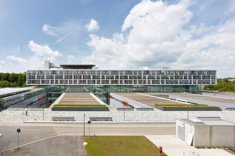 Die Chirurgische Klinik mit 15 OP-Sälen, 235 Normalpflege- und 80 Intensivpflegebetten gliedert sich in einen 2- bis 3-geschossigen Sockel, der sämtliche Funktionsbereiche beherbergt und ein „schwebendes“ Bettenhaus. Farblich variierende Öffnungsflügel bringen eine besondere Lichtstimmung in jedes Patientenzimmer. Vier warme Farbtöne – Gelb, Orange, Rot und Braun – sind Teil des Gestaltungskonzeptes und finden sich im gesamten Gebäude wieder. Sie sorgen für ein freundliches, helles Ambiente.