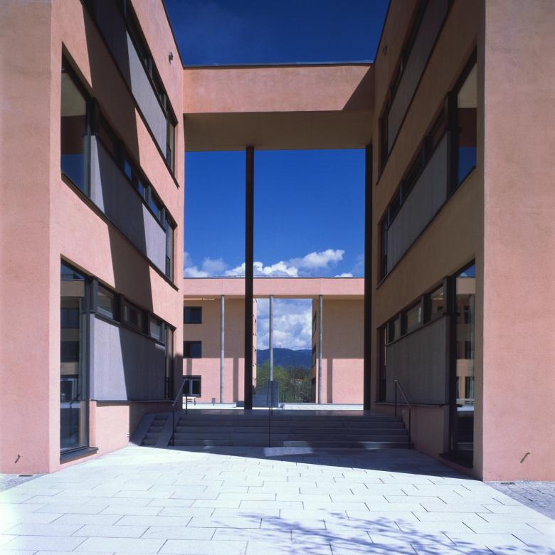 Das Fachhochschulgelände entwickelt seine eigene Identität in dem von Gewerbe- und Dienstleistungsbetrieben geprägten, heterogenen Umfeld. Als verbindendes Glied stellt es mit Öffnungen und Durchwegungen Querbezüge zum angrenzenden Stadtpark und zum Donauufer her.