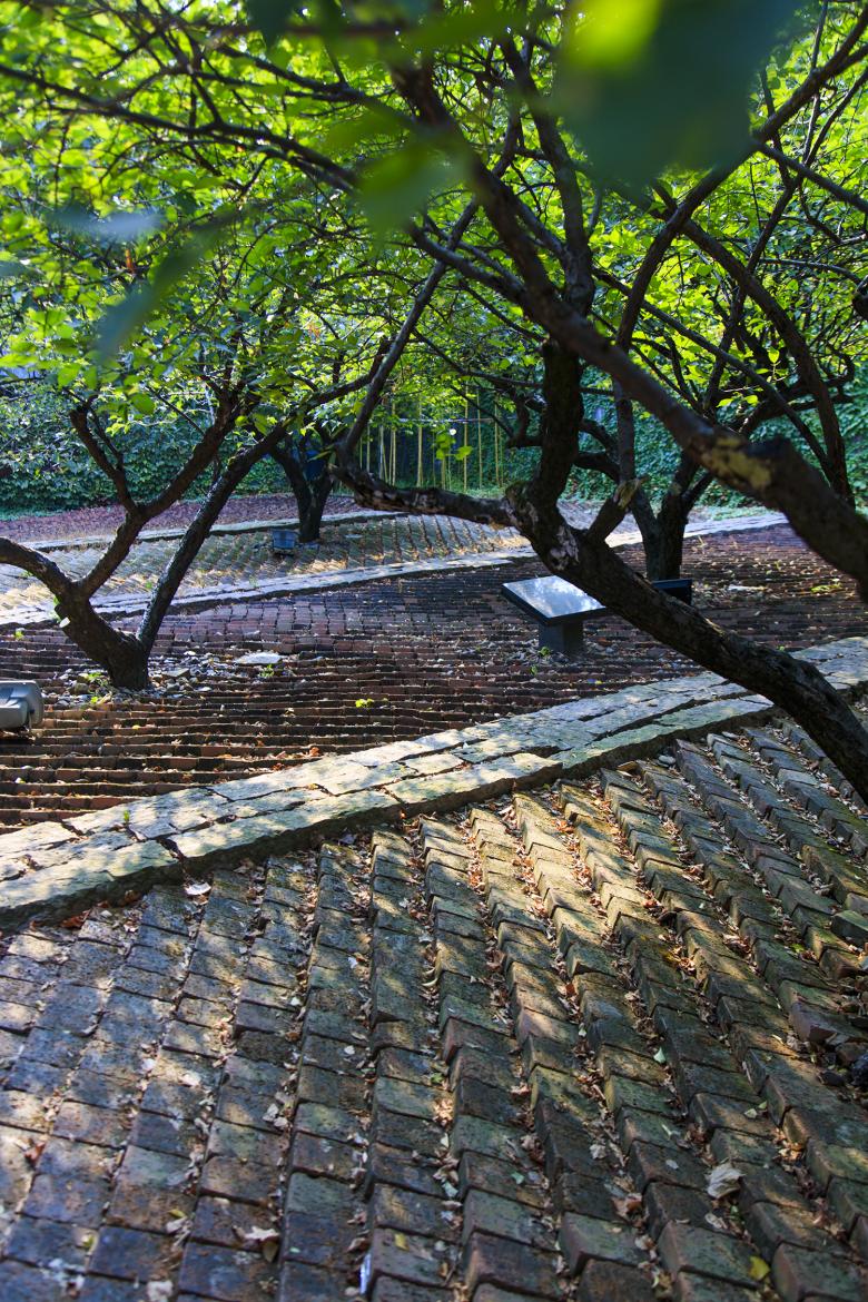 (3) A matrix of boxes hiding the famous flowers: At the end of the creek and after the water is cleansed by the constructed wetland, the water runs through a matrix of nine boxes and front and rear clearings. The boxes are 4.5 meters (about 15 ft) high and 24X24 meters (about 79 ft) in size. 6 boxes are designed to exhibit Mei Flower of various cultivars; each box is floored with one of the local materials, including black or red tiles, black or red bricks, or white or red gravel. Three boxes in the middle row are water gardens filled with lotus, another poetic flower highly appreciated in Chinese tradition that symbolizes cleanliness and purity despite the dirty environment. It blooms in the summer and has magnificent foliage that is appreciated all through the seasons, and even in winter when its foliage is withered. The black walls are largely covered with Parthenocissus tricuspidata, an creeper plant that grows to cover surfaces and displays brilliant red and golden colors in the fall The individual boxes are interconnected through a network of corridors that are integrated with awnings, providing shade and protecting visitors from rain, creating a comfortable experience even during the sweating hot summer and sticky rainy days. The foliage covered walls are pierced with viewing windows that are inspired by the Chinese traditional garden walls to create a porous landscape.