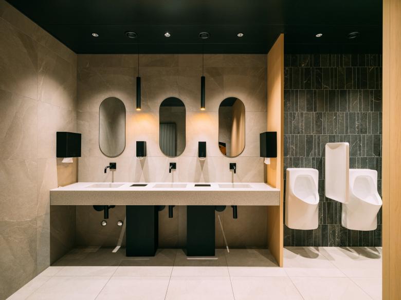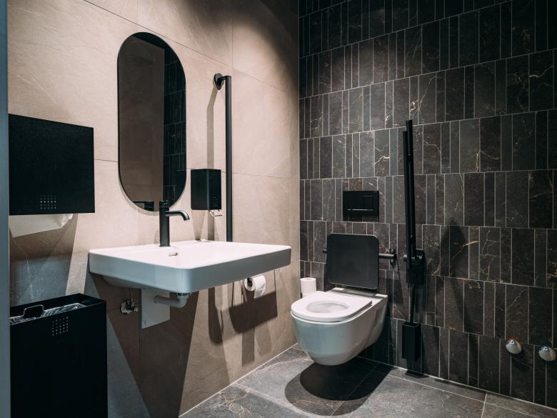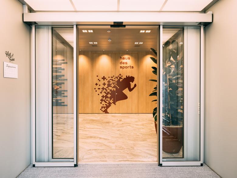 Mit dem neuen Konzept soll der Eingangsbereich und die Nasszellen im Haus des Sports eine lebendige und einladende Atmosphäre erhalten, welche gleichzeitig den sportlichen Geist widerspiegelt. Die elegant gestaltete Empfangstheke heisst die Besucher:innen willkommen, während die Lounge im Wartebereich mit bequemen Sitzgruppen zum Verweilen einlädt. Bewegte Wandbilder mit dynamischen Sportmotiven widerspiegeln den Charakter des Hauses und machen die Bewegung unmittelbar im Raum erlebbar.