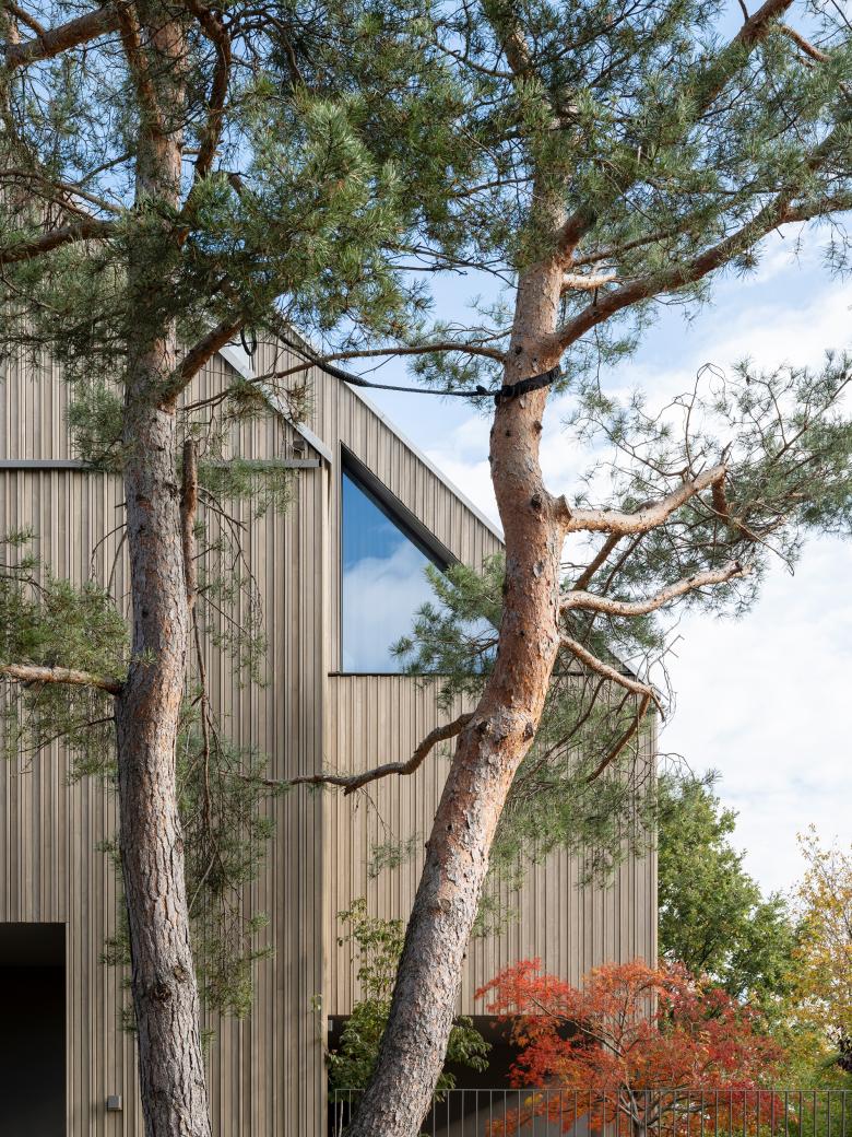 Eine grüne Oase umgibt das Haus, in dem zwei Parteien wohnen. Der alte Baumbestand verleiht der Parzelle, die in der Zürcher Gemeinde Kilchberg liegt, einen ländlichen Charakter. Das Wohnhaus, das 1934 entstand, war ursprünglich als Einfamilienhaus konzipiert und wurde in den achtziger Jahren zum Mehrfamilienhaus umgebaut. 2021 wurde ein kompletter Umbau inklusive Aufstockung realisiert. Einen gänzlich neuen und äusserst modernen Charakter verleiht dem Haus die Holzfassade.