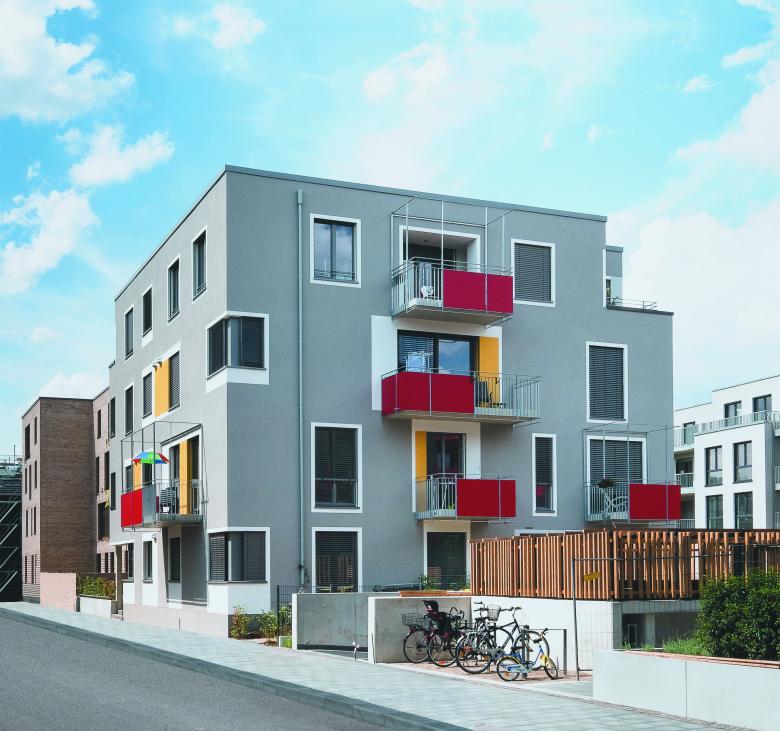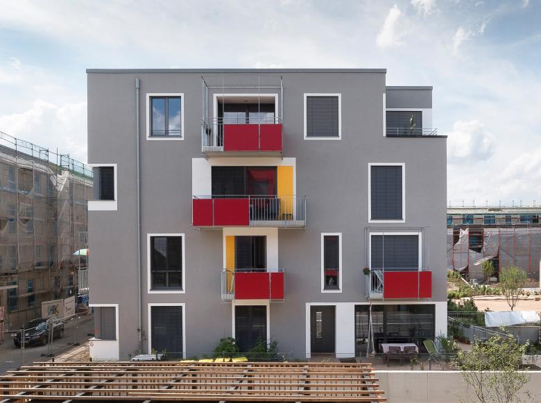 farbliche Differenzierung der Fassaden, die ausgehend von dem gemeinsamen Haus als kompaktem silbergrauen Kubus durch eine einheitliche farbliche Betonung der Öffnungen das individuelle Leben hinter den Mauern sichtbar machen wollte. War zunächst durchaus strittig, ob weiß auf grauem Grund nicht ausreichte, so setzte sich im weiteren Verlauf die Auffassung durch, man könne in der durchgehend von dunklem Ziegel geprägten Umgebung durchaus einen etwas bunteren und unbekümmerten Auftritt wagen.