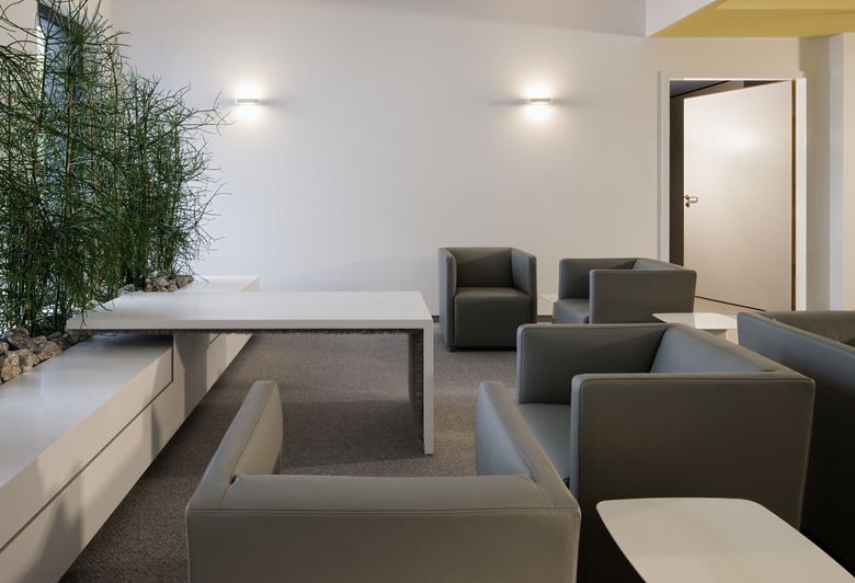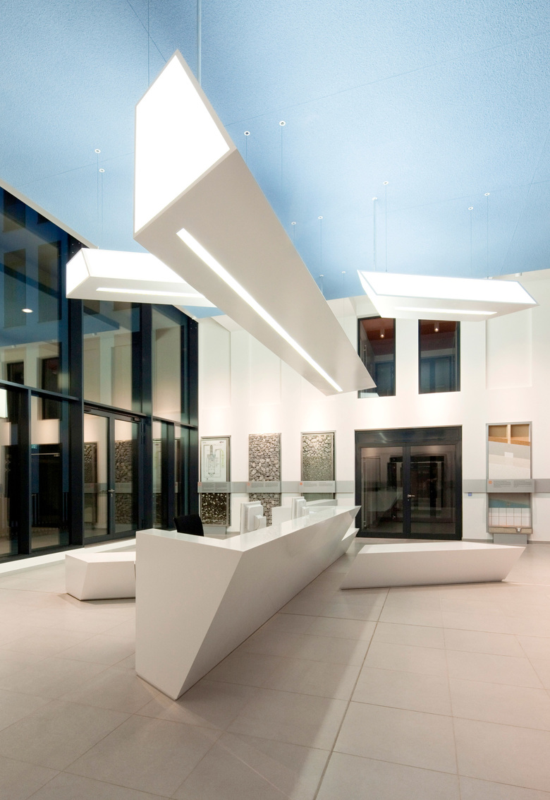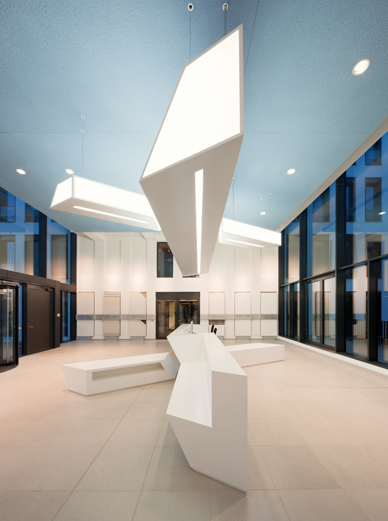 Beim Eintritt in das Foyer präsentiert sich das Unternehmen mit einem skulpturalen, liegenden »X« – eine grafische Anspielung auf das Logo von Xella. Dieses Objekt fungiert zum einen als offener Empfangstresen, dient aber auch als Sitzgelegenheit. Ein gespiegeltes Pendant hängt von der Decke herab: Als Lichtobjekt kann es durch moderne Lichttechnik die Lichttemperatur dem Verlauf des natürlichen Tageslichtes anpassen und wirft je nach Lichteinfall wandernde Schatten ins Foyer. Das Unternehmen Xella präsentiert sich also nicht statisch, sondern dynamisch – und zudem auch kommunikativ: Entlang der Wände sind Präsentations-Boxen eingelassen, die die Originalprodukte visuell und haptisch vorstellen.