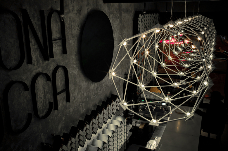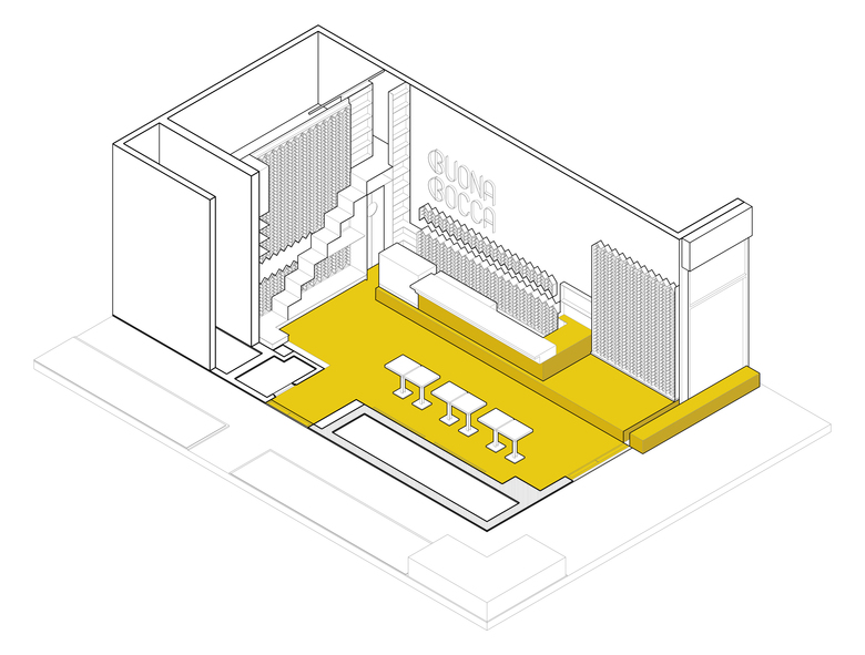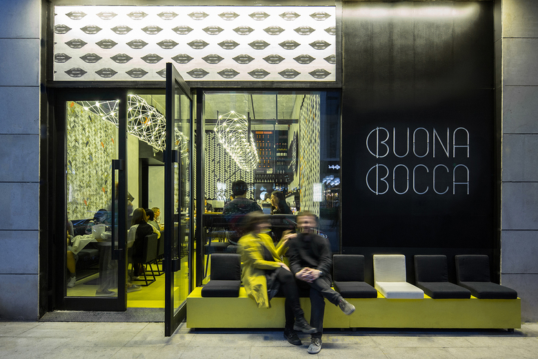 Brick patterns on walls, made of sliced traditional hutong bricks, play a central decorative role in the design of the wine bar. Insertions of black iron plates create zig-zag shaped shelves and displays for wine bottles, while custom-made wallpapers. Concrete ceiling and exposed building pipes underline a sense of urbanity and re-appropriation. Yellow floor and large geometric chandeliers on ceiling strengthen the vibrant atmosphere of the space and evoke the surprise and festivity feeling of typical town festivals in south of Italy.