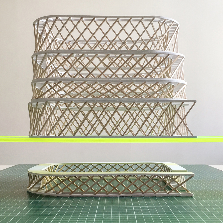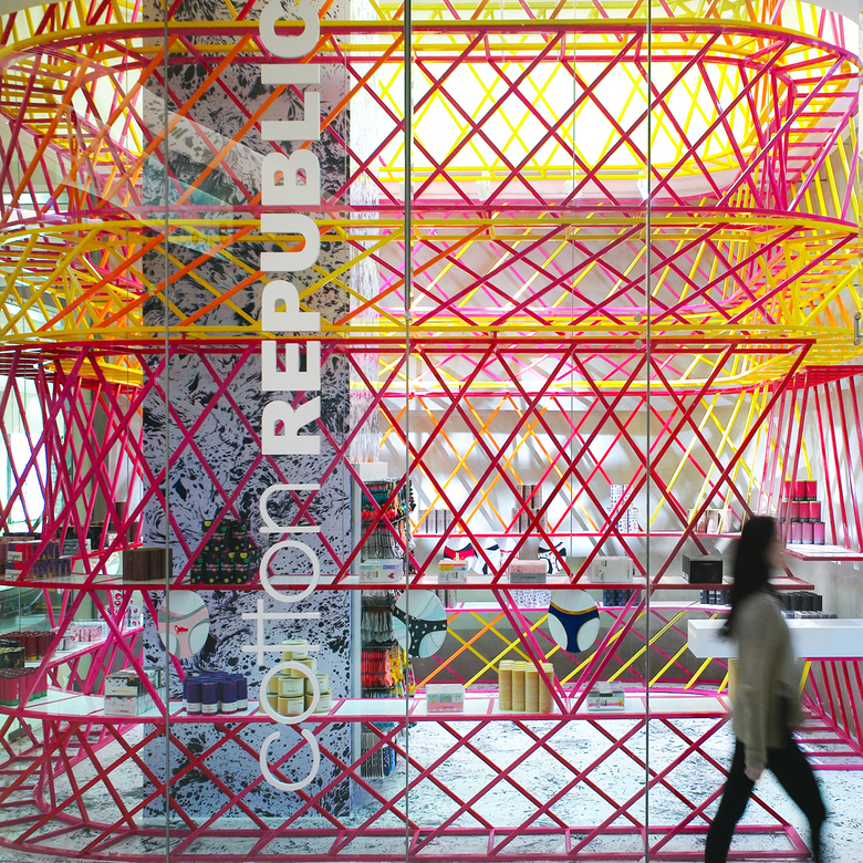 The inspiration for the project comes from the idea to invite visitors into the shop by creating a mysterious and attractive object which will raise their expectations and generate surprise. Five basket-like ribbons are overlapping on each other creating an open yet interlaced structure coloured with shiny tones of yellow red and pink. Products will be displayed on the internal exhibition room and illuminated by a diffuse light coming from the ceiling that will pair with the white resin floor.