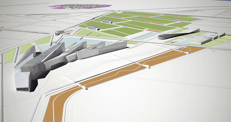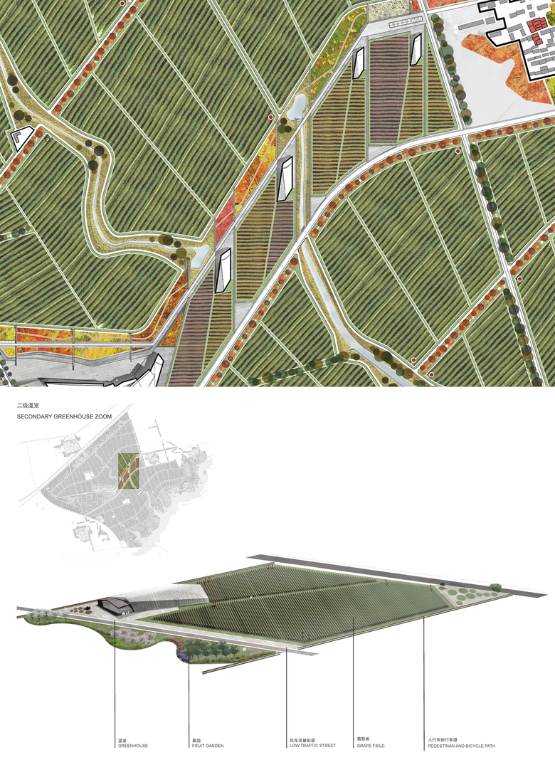 Design for the “Shan Shui Grape Garden” arises from a careful reading of the rhythm of the territory, which is a system of parallel lines running from east to west. Three new main “ECOLOGICAL RIBBON ROUTES”, where activities and functions are located, are placed onto a large VINYARDS CARPET dotted with fruit trees. A system of “NATURAL CORRIDORS” will define the connecting path network, viable by biking, walking, riding a horse or rowing a boat. The resulting network of walkable paths and gardens will offer an ecological infrastructure model for the wider territorial park which can be extended along the river.