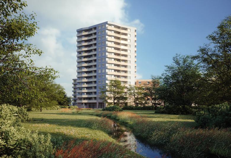 Durch die hochwertige Materialwahl und eine sorgfältige Ausbildung der Details wirkt das Wohnhochhaus mit seinem polygonalen Grundriss maßstäblich und freundlich innerhalb des dicht bebauten städtebaulichen Kontextes. Mit seinen raumhohen Fenstern und den sonnenorientierten Balkonen bietet es besondere Qualitäten.
