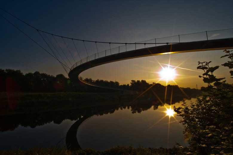Die Hängebrücke quert den Rhein-Herne-Kanal und ermöglicht den Anschluss der Radwegeverbindung Erzbahntrasse an den Emscher Park Radweg. Sie funktioniert als einseitig aufgehängter Kreisringträger mit einer Spannweite zwischen den Widerlagern von 141 m, das Tragseil und die im Abstand von 3 m angeordneten Hängerseile sind dabei am äußeren Rand des Überbaus angeschlossen. Das Seiltragwerk mit girlandenförmiger Tragseilführung beginnt 24 m hinter den Widerlagern und wird über den ca. 45 m hohen Mast am Nordufer abgespannt. Ein torsionssteifer Stahlhohlkasten mit nur 80 cm Bauhöhe bildet das Rückgrat des Brückendecks und trägt die 12 cm dicke Betonplatte, die als robuster Gehbelag dient und mit ihrem Gewicht und ihrer Dämpfung das dynamische Verhalten der Brücke begünstigt. Ein transparentes Seilnetzgeländer unterstreicht die Leichtigkeit und Filigranität des Stegs.